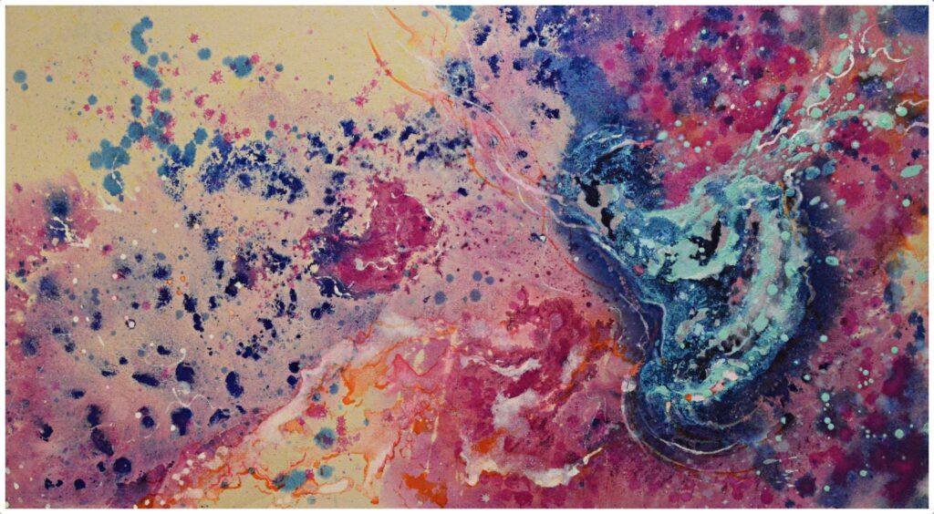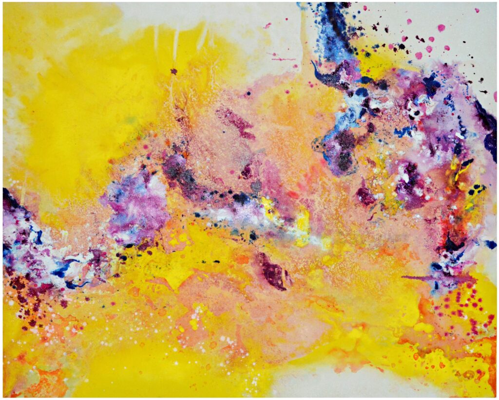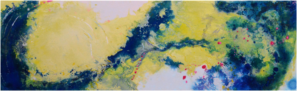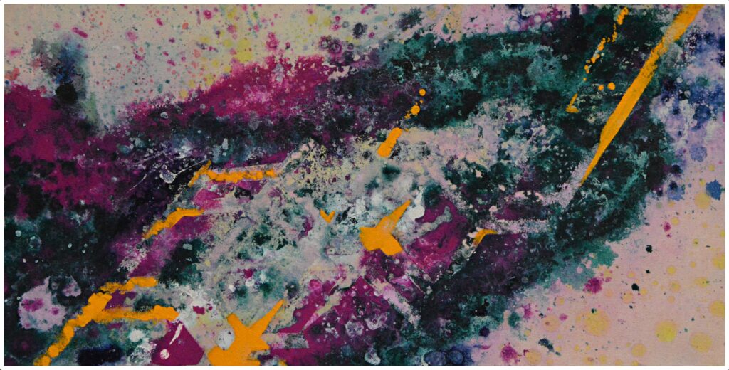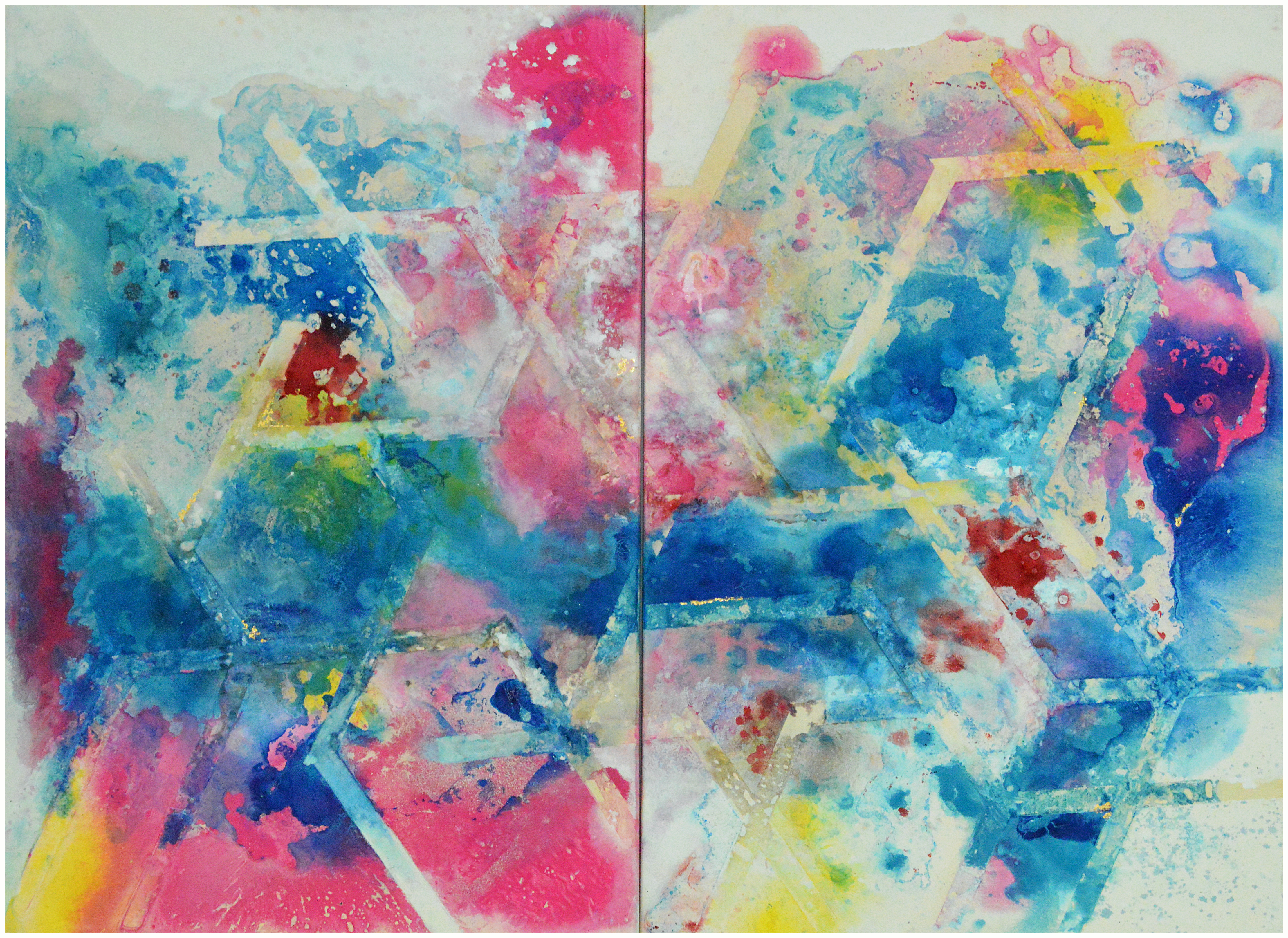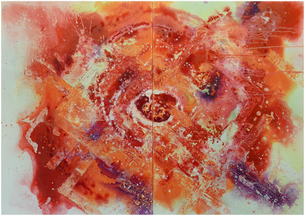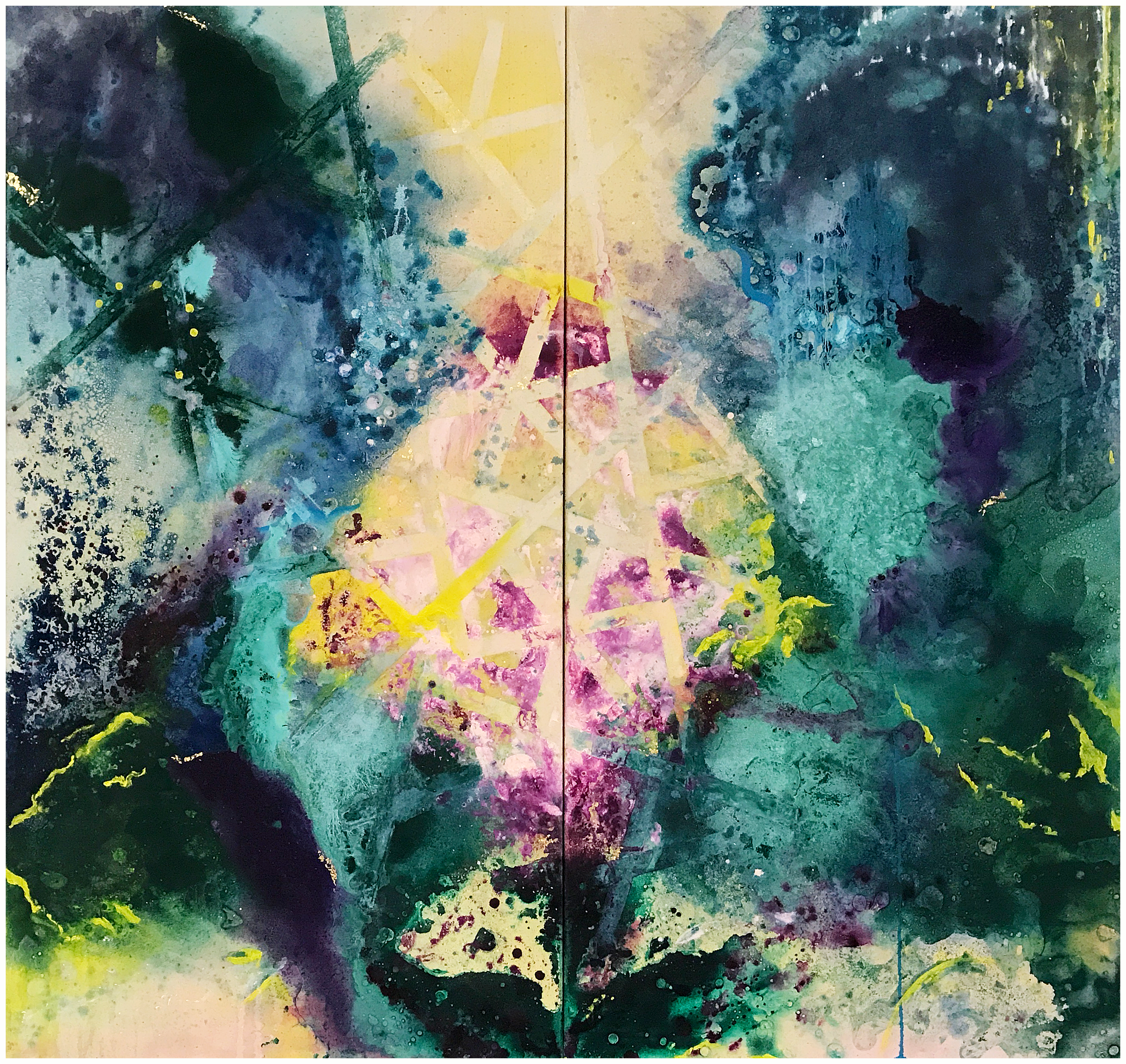 Oil, ink, glitter and imitation leaf on canvas